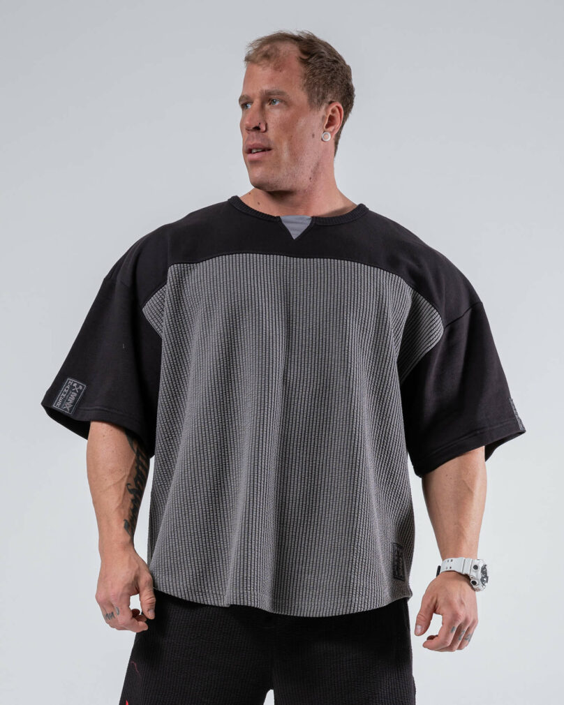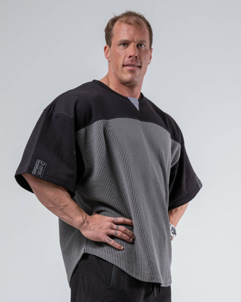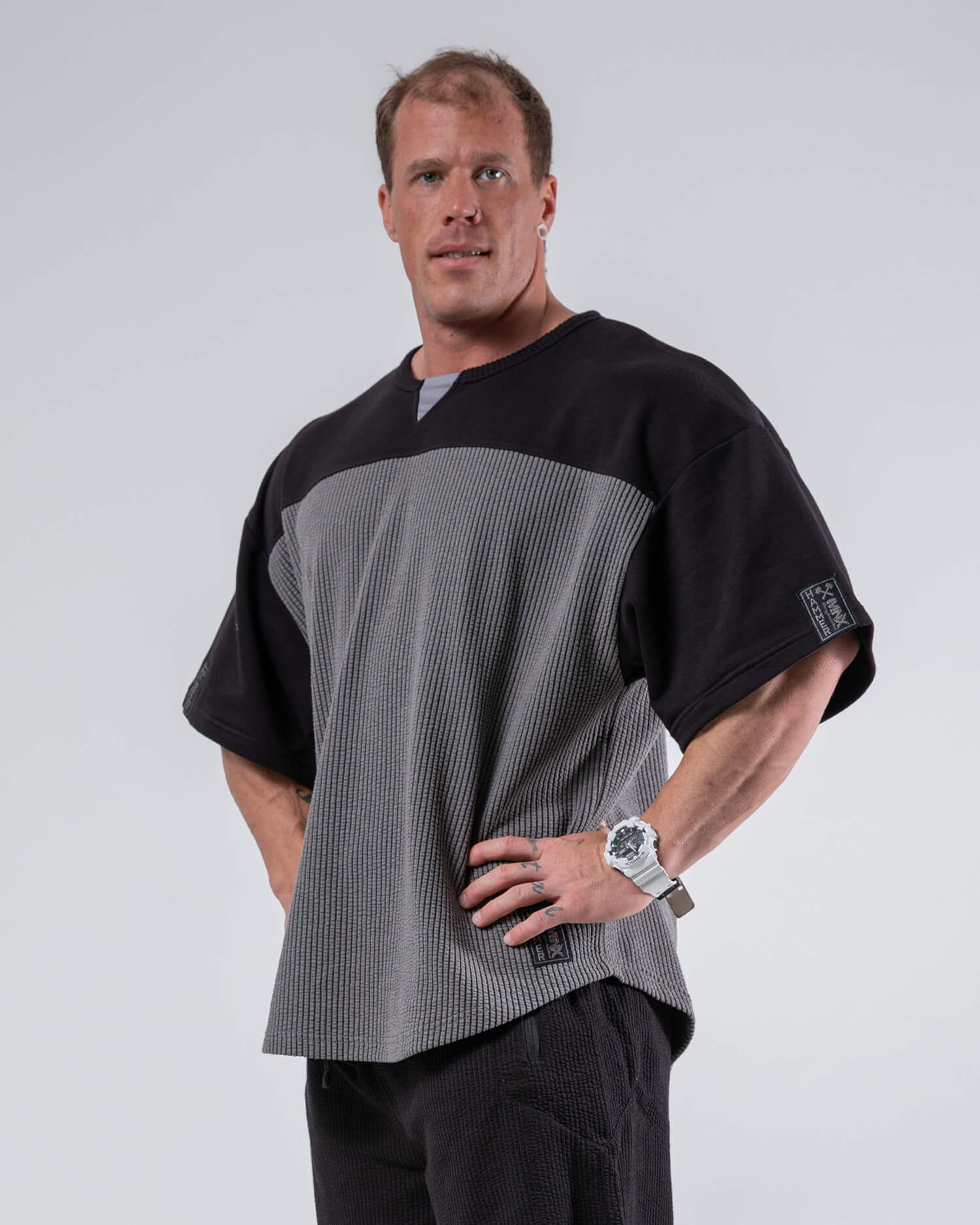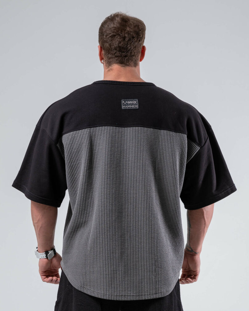 Questo oversize top da allenamento รจ una fusione moderna di abbigliamento da bodybuilding e stile streetwear. Realizzata in caldo tessuto a costine con vestibilitร oversize e rilassata. Combina questo top da allenamento con i pantaloni Hammer e crea un outfit perfetto.