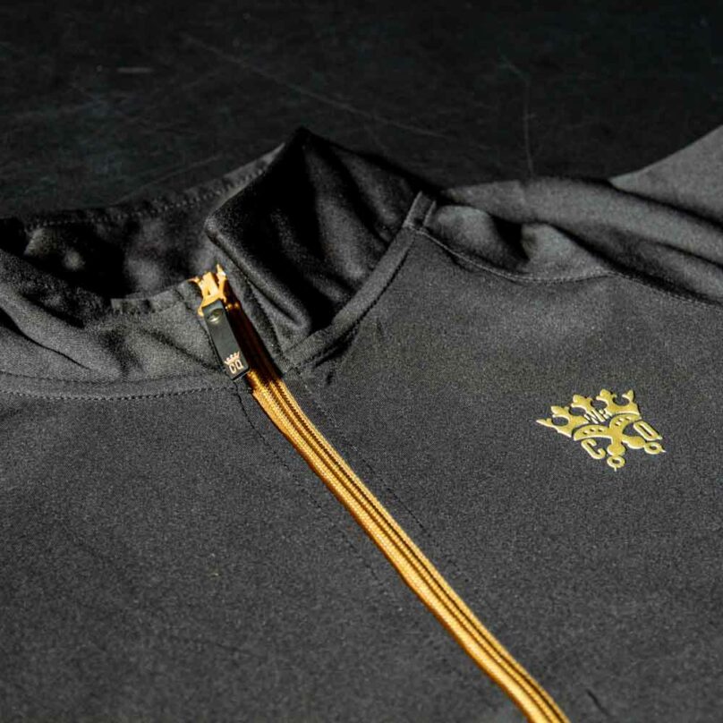 This track jacket in black & gold color combination is a perfect choice for casual moments. Zipped pockets to store your essentials. Unique Conqueror details.